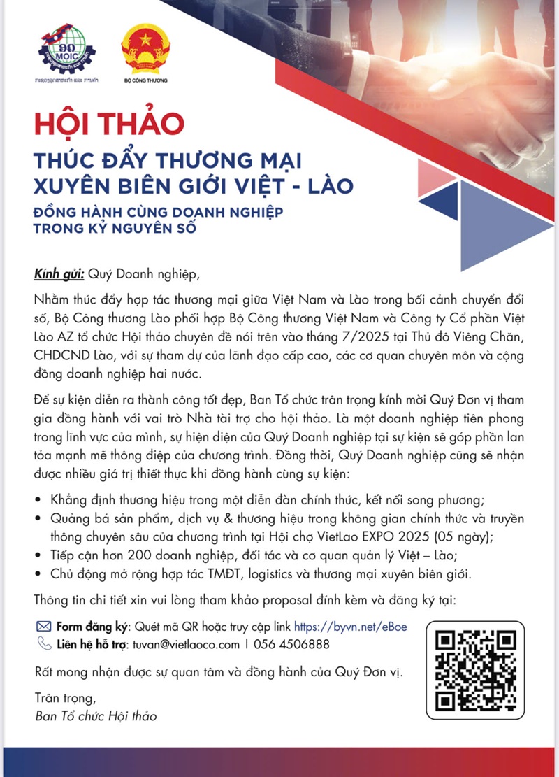 Sự kiện nổi bật: Một trong những điểm nhấn đặc biệt và mang giá trị thiết thực trong khuôn khổ VIETLAO EXPO 2025 là Hội thảo “ĐỒNG HÀNH CÙNG DOANH NGHIỆP TRONG KỶ NGUYÊN SỐ – THÚC ĐẨY THƯƠNG MẠI XUYÊN BIÊN GIỚI VIỆT – LÀO”.